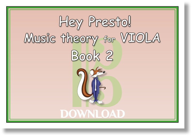 (PDF version of Hey Presto! Music Theory for Violists, Book 2) Second workbook in the series (6 books), designed to take beginners on the viola to Grade 1 theory level and beyond, relating it to their instrument, and building confidence right from the start. This book builds on and reinforces everything learnt in book 1 as well as gently introducing new topics, using clear, concise and easy to follow explanations. All of the important subjects are repeated in varying ways, the characters Presto, Bravo and Poco help to bring the subject to life and fun pages also help to make this a highly enjoyable grounding in music theory!