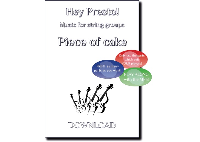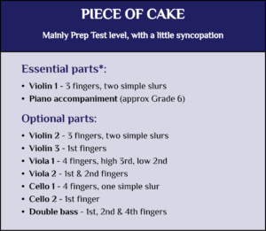 An energetic, approachable piece with a middle section featuring a syncopated rhythm (violins 1 & 2, viola 1 & cello 1) and some basic harmonics, pizzicato and a single left-hand pizzicato note in the Violin 2 & 3 parts. A favourite with beginning string players!