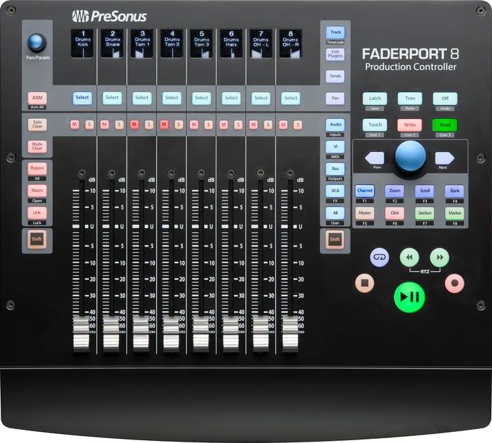 So why did I want one? Why do you want one? Go have another look at your DAW. How many of those sliders can you change the volume on at the same time just using your mouse. One, right? Now, when I record an electric guitar playing I set a mike in front of the speaker, then split the signal from the guitar, DI to the DAW, and take the other line to the amp and take the output from the amp to the DAW, so I have 3 channels for that one instrument. On mixing I might want to take the volumes down all at the same time, or vary the mix between the 3. You can’t do that with a mouse. If you’re good (and I’ve worked with some very good sound engineers) you can use all eight of your fingers (thumbs don’t count) simultaneously to craft your production. OK, you can stack your tracks but that just kicks the can down the road. With the Faderport you can mix percussion, vocals, guitars, keyboards ALL at the same time and without having to change your pointers focus.